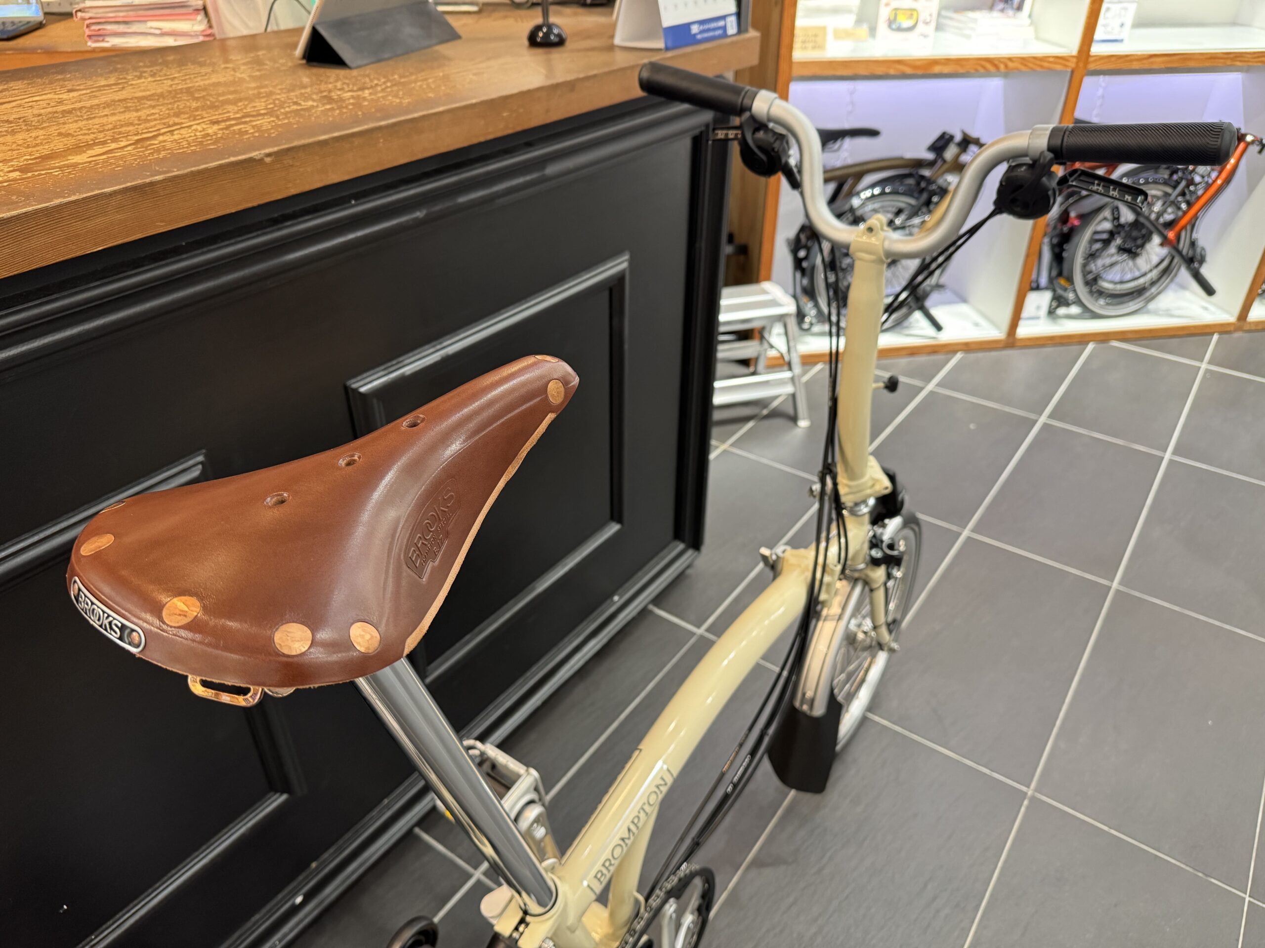 その中でも最初のカスタムとして選ばれることが多いのが、BROOKSのレザーサドルです。BROMPTONとの相性が非常によく、クラシックで上品な雰囲気が加わるため、見た目のドレスアップとしても人気の商品です。
