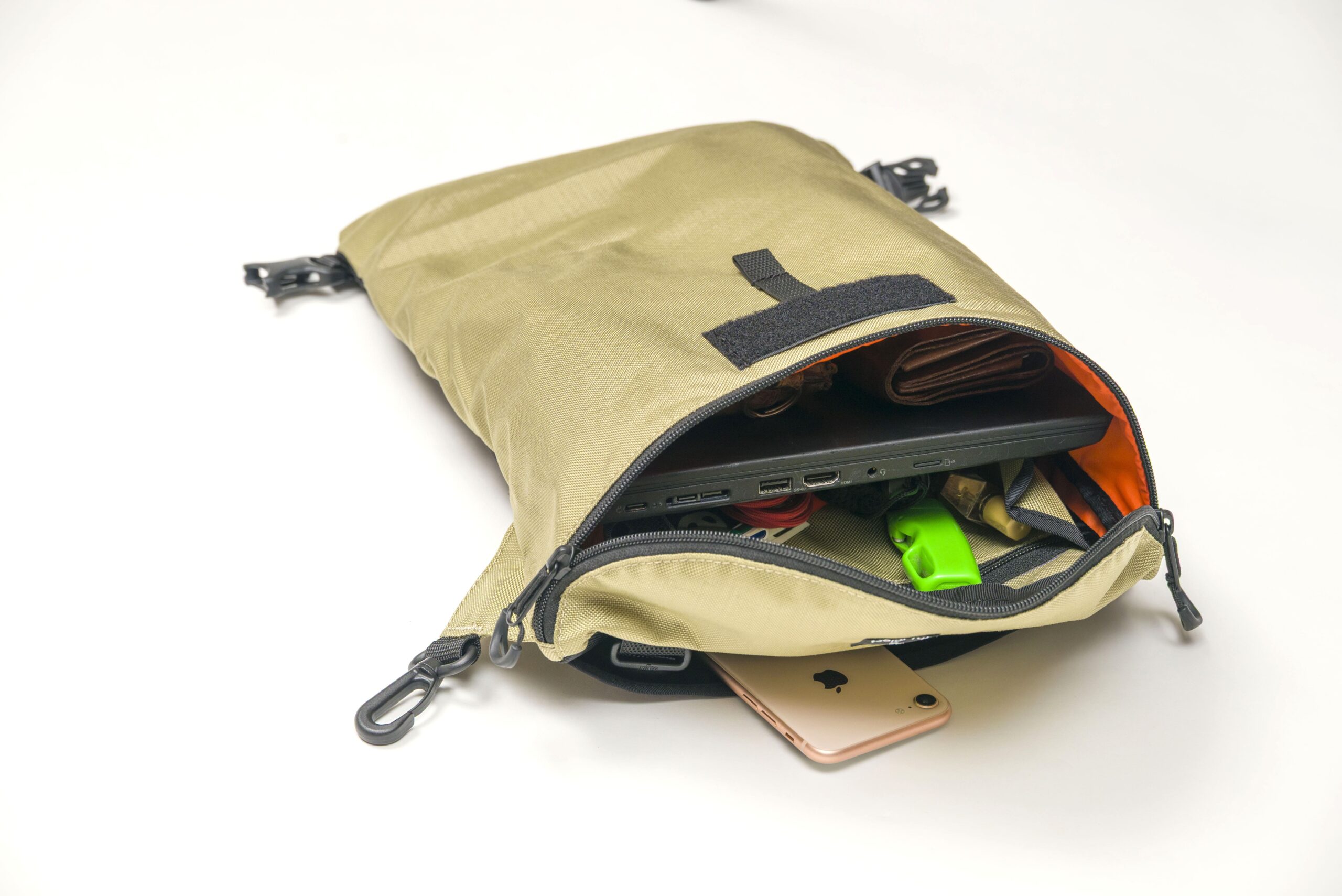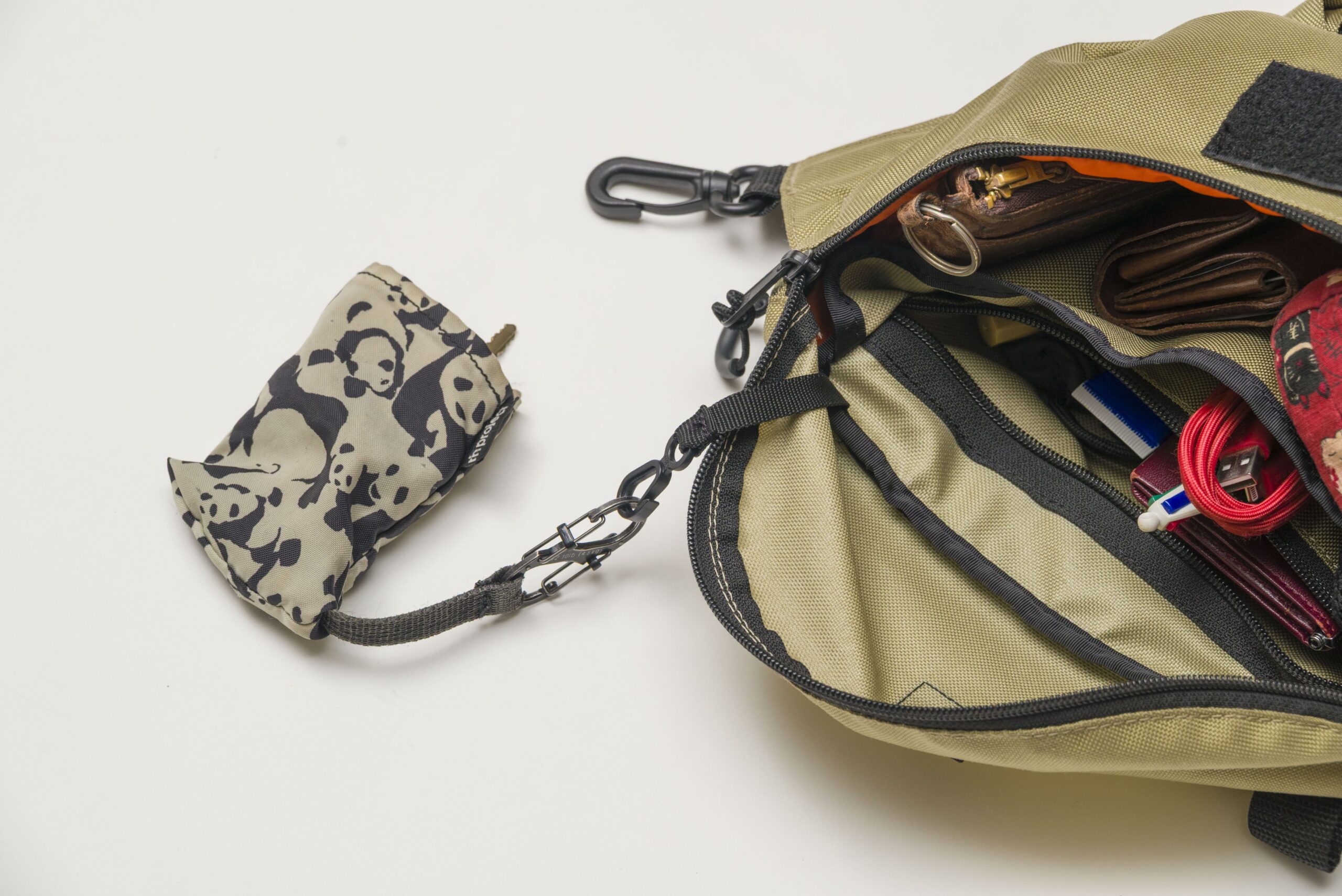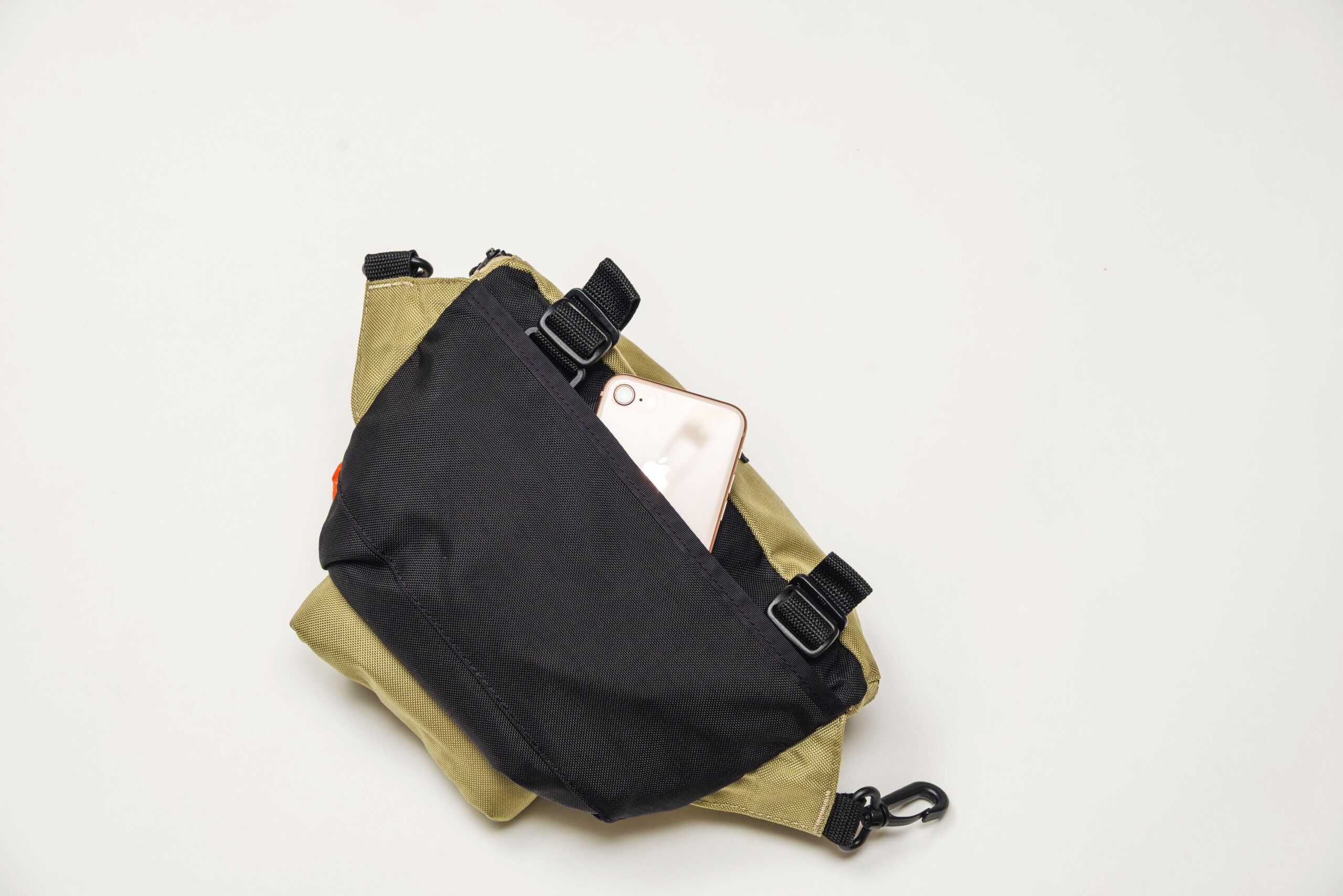 内部にはファスナー付きポケットやマチ付きポケット、キー用フックを備え、小物整理もしやすい設計。前面のベルクロやライト用ループなど、自転車用途をしっかり考えたディテールも魅力です。