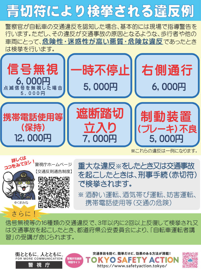 これまで自転車の違反は「指導警告」や、重大な場合は刑事手続きという形でしたが、今後は一定の違反に対して反則金を納めることで手続きが完了する仕組み(いわゆる青切符)が適用されます。