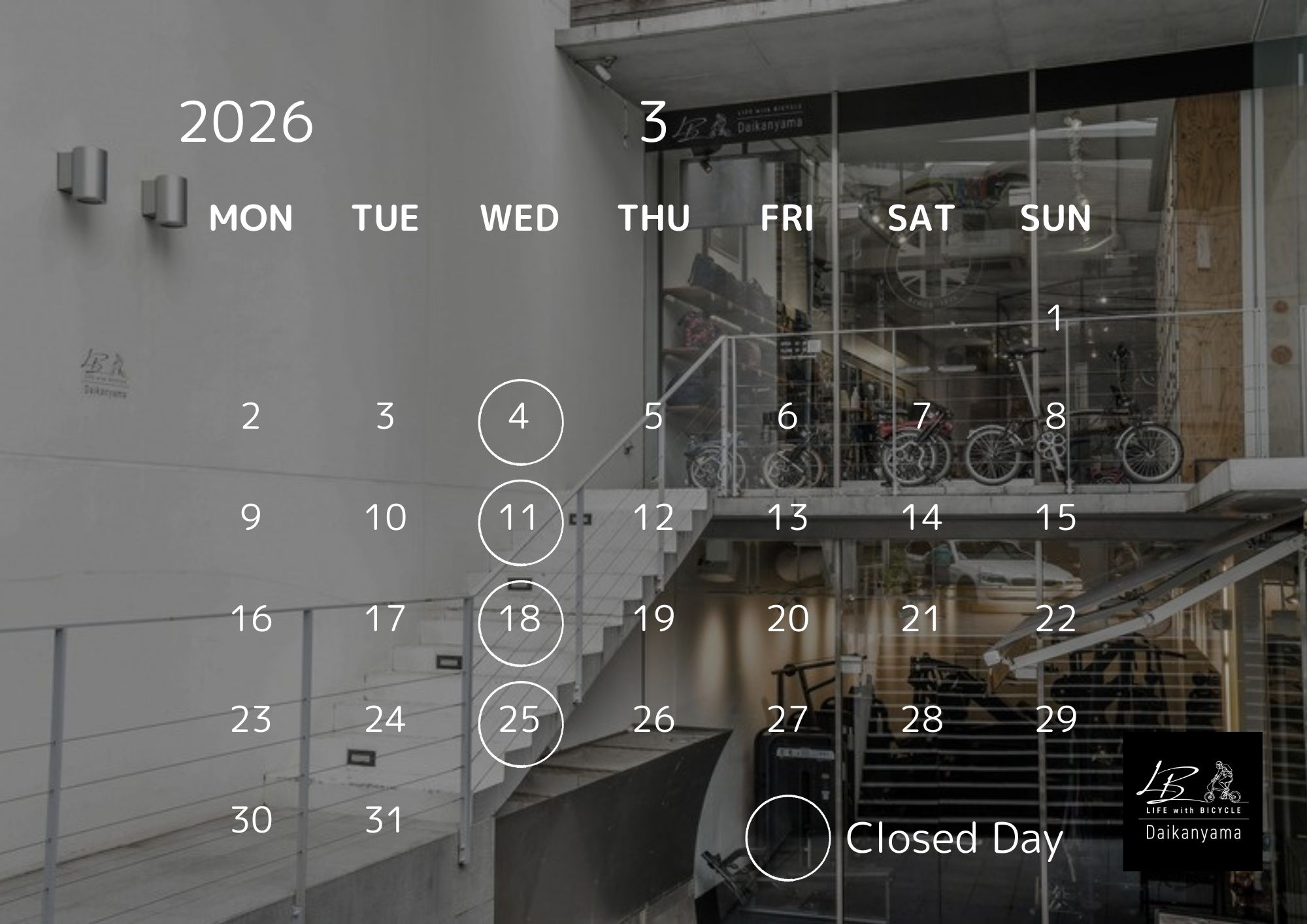 3月の定休日は4日(水)、11日(水)、18日(水)、25日(水)です。