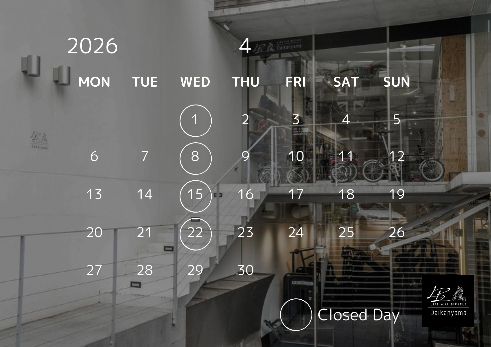 4月の定休日は1日(水)、8日(水)、15日(水)、22日(水)です。