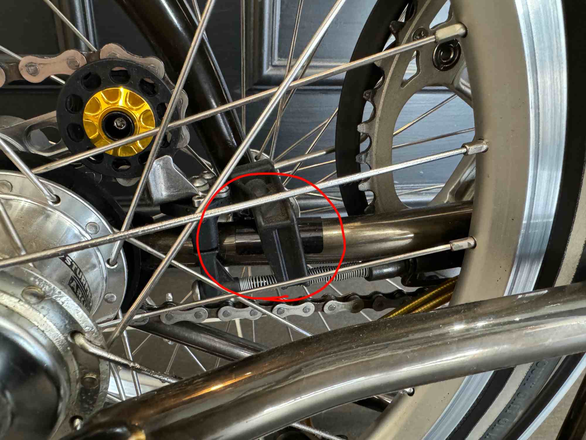 折りたたみ時にフロント側のフックが掛かるリアフレーム部分。